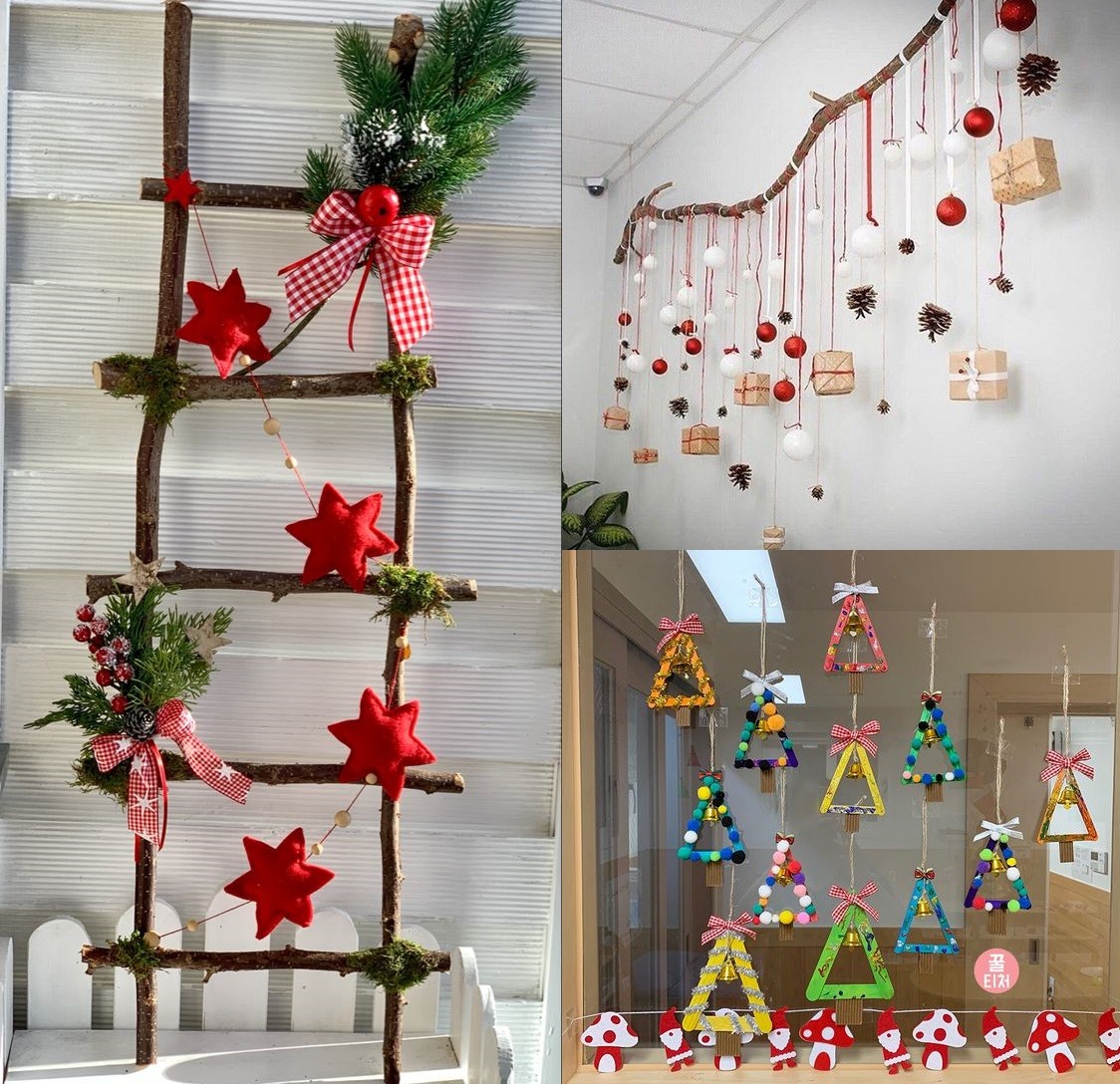 - Cây thông Noel treo trần nhà: Đây là một ý tưởng độc đáo và tiết kiệm diện tích. Bạn có thể dùng vòng mica, ông già Noel, quả cầu... và kết hợp với đèn LED để tăng thêm sự lung linh.