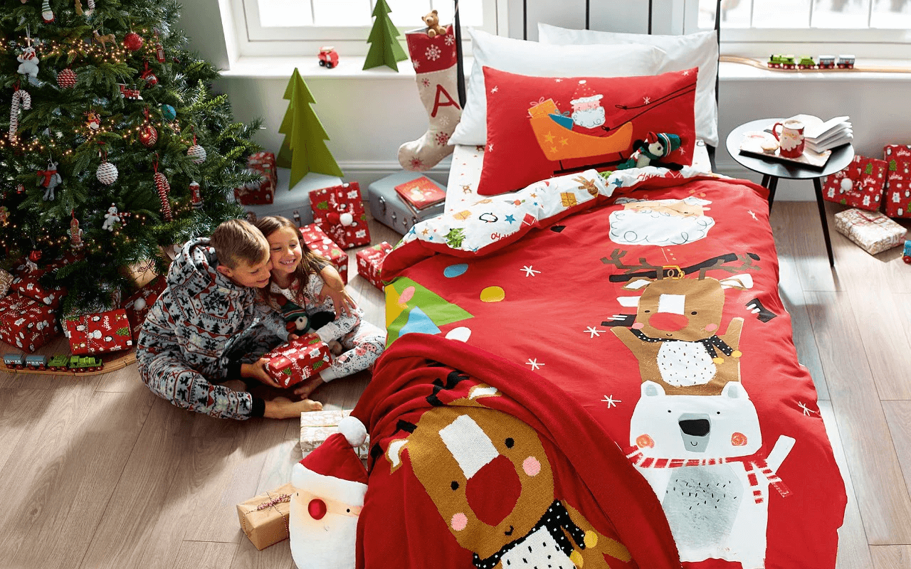 - Thay bộ chăn ga gối chủ đề Noel: Cách đơn giản nhất để thay đổi không khí phòng ngủ. Chọn bộ chăn ga có họa tiết đặc trưng như cây thông, bông tuyết, ông già Noel với màu sắc đỏ, xanh lá, trắng.