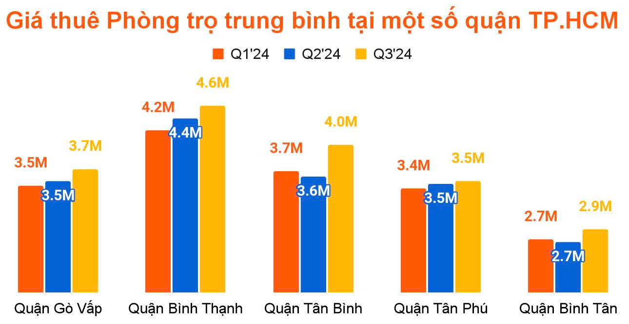 Thực tế, tại khu vực Tp.HCM, tính từ đầu năm đến nay trong khi giá thuê căn hộ chung cư (CHCC) duy trì ổn định, thì giá thuê phòng trọ ghi nhận mức tăng ở hầu hết các quận có nhu cầu cao. Nguyên nhân chính cho tình trạng tăng giá thuê Tp .HCM chủ yếu do giá mua căn hộ chung cư và nhà đất liên tục tăng từ đầu năm 2024, khiến lựa chọn của người mua bị thu hẹp. Nhiều người dân đã chuyển sang giải pháp thuê nhà thay vì mua, góp phần làm tăng nhu cầu thuê bất động sản.