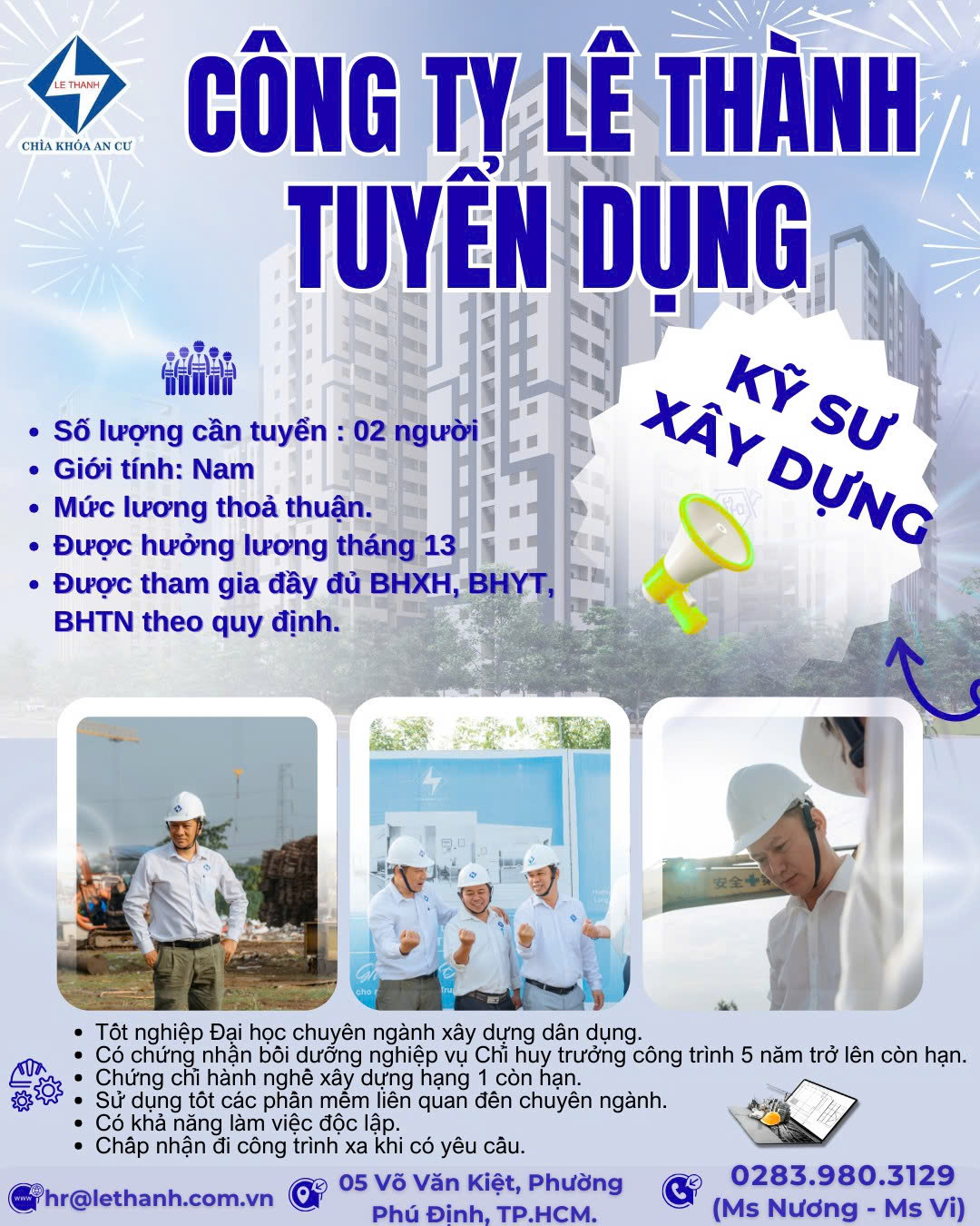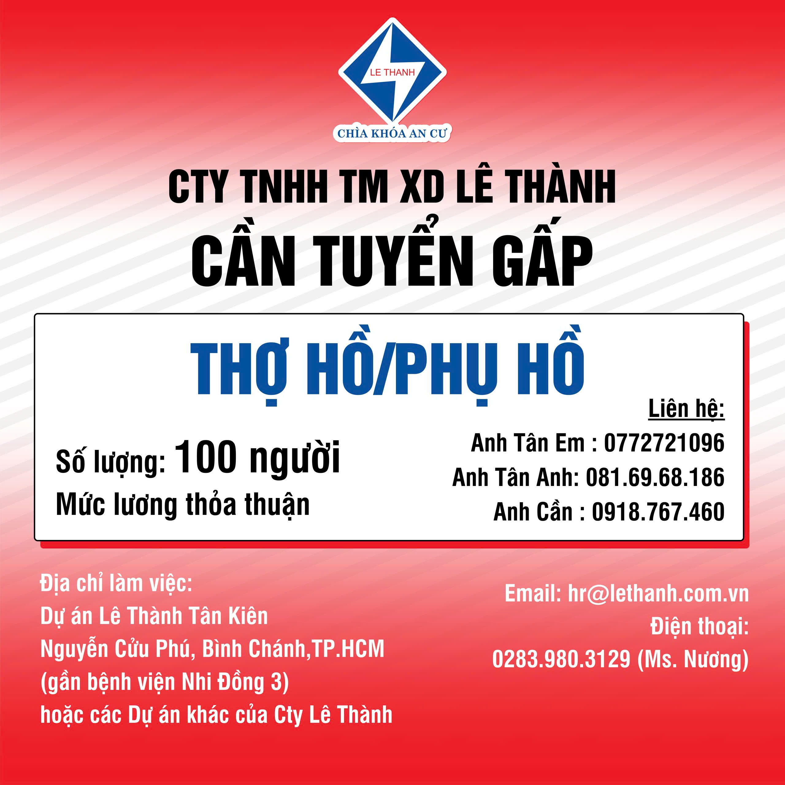 📩 ỨNG TUYỂN NGAY HÔM NAY: 📍 Văn phòng: 05 Võ Văn Kiệt, P. Phú Định, Quận 8 hoặc 113/89 An Dương Vương, An Lạc, TP.HCM. 📧 Email: hr@lethanh.com.vn. ☎️ Hotline Nhân sự: 028.3980.3129 (Ms Nương - Ms Vi). 📞 Hotline Khối thi công: Anh Tân Em (0772.721.096) - Anh Tân Anh (081.69.68.186) - Anh Cần (0918.767.460).