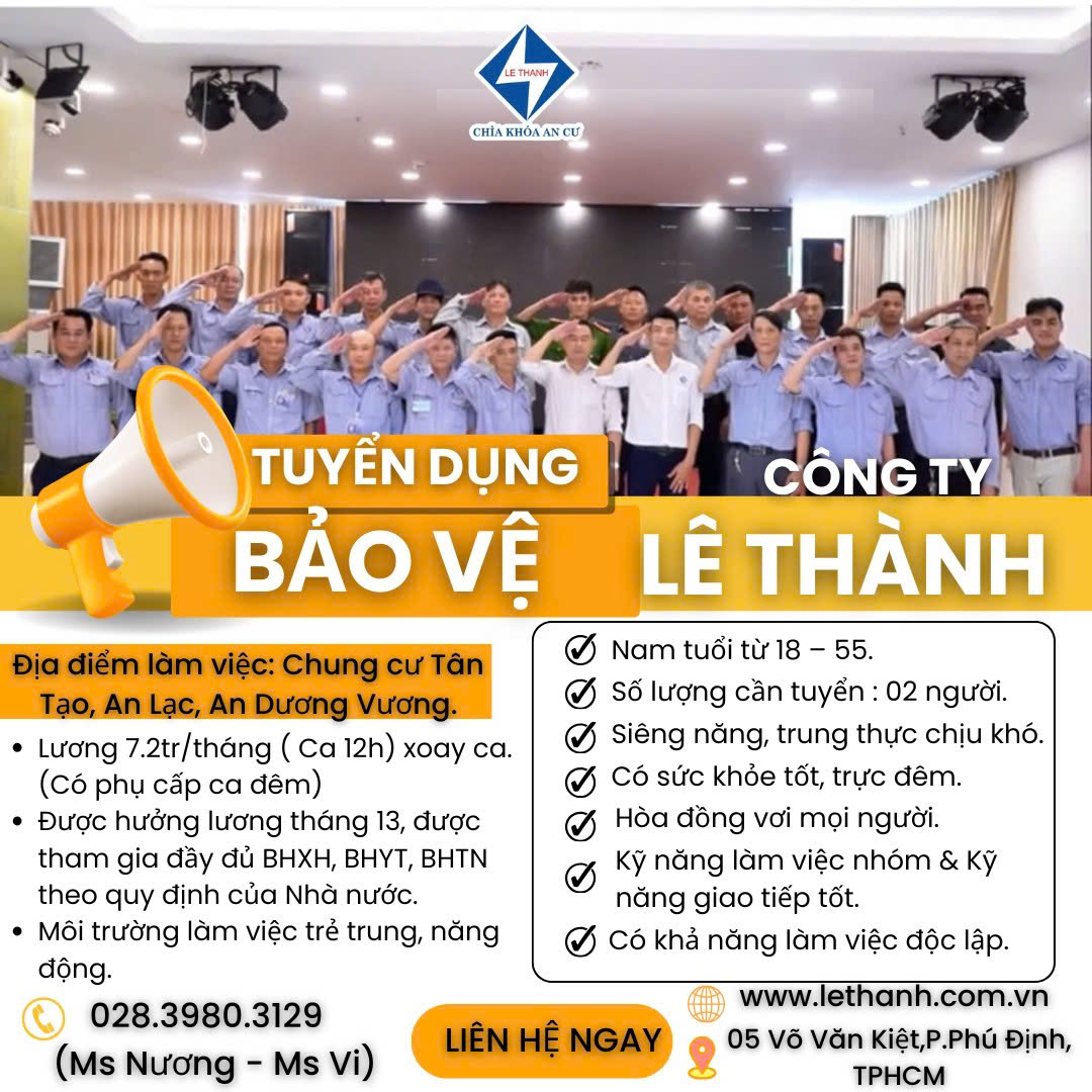 Nhân viên Bảo vệ (02 Nam): Độ tuổi 18-55, sức khỏe tốt, cùng chúng tôi giữ gìn sự bình yên cho cư dân tại các chung cư Tân Tạo, An Lạc, An Dương Vương.